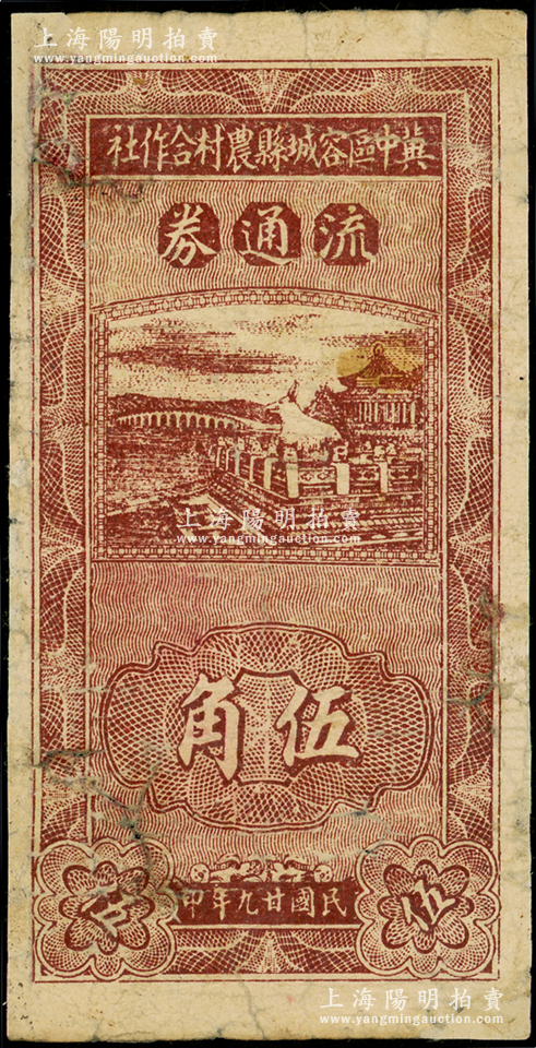 民国廿九年(1940年)冀中区容城县农村合作社流通券伍角,有修补,近七成新