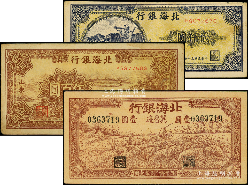 北海银行纸币3种,详分:1942年“冀鲁边”地名牧羊图壹圆,1947年棕色锯木插秧图伍百圆,1948年长城吹号图贰仟圆,原票七五至八五成新