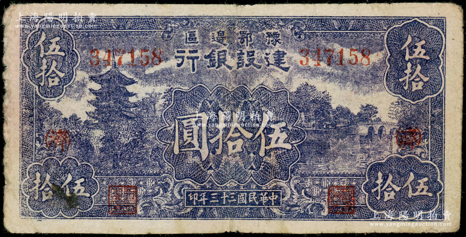 民国三十三年(1944年)豫鄂边区建设银行蓝紫色山塔与湖景图伍拾圆,加印红色“(济)”字;资深藏家出品,原票七成新