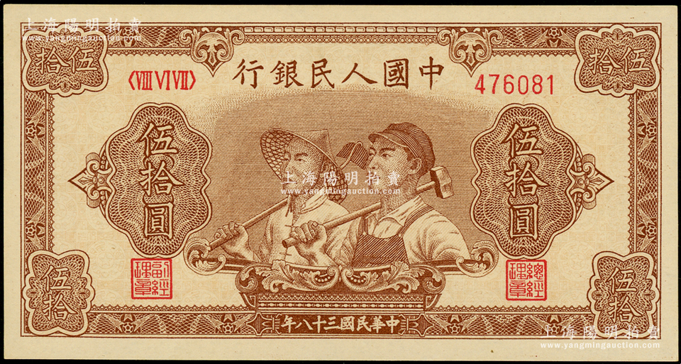 第一版人民币“工农图”伍拾圆,6位数号码券,全新