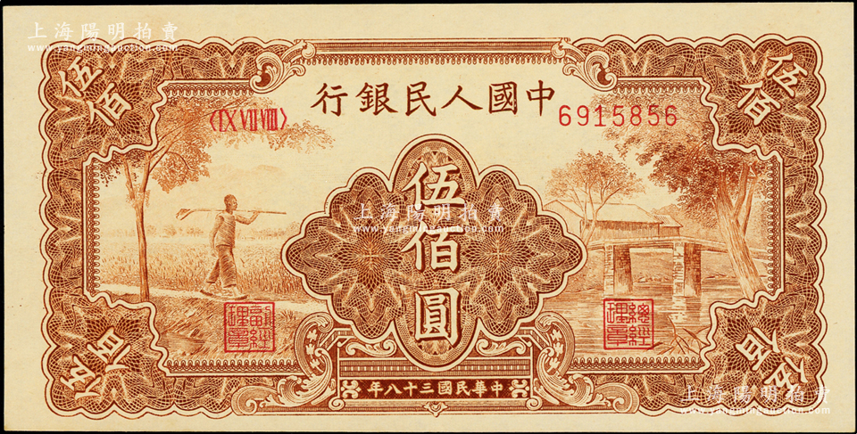 第一版人民币“农民小桥图”伍佰圆,九八成新