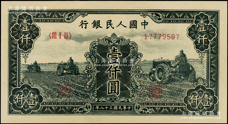 第一版人民币“黑三拖”壹仟圆,九八成新