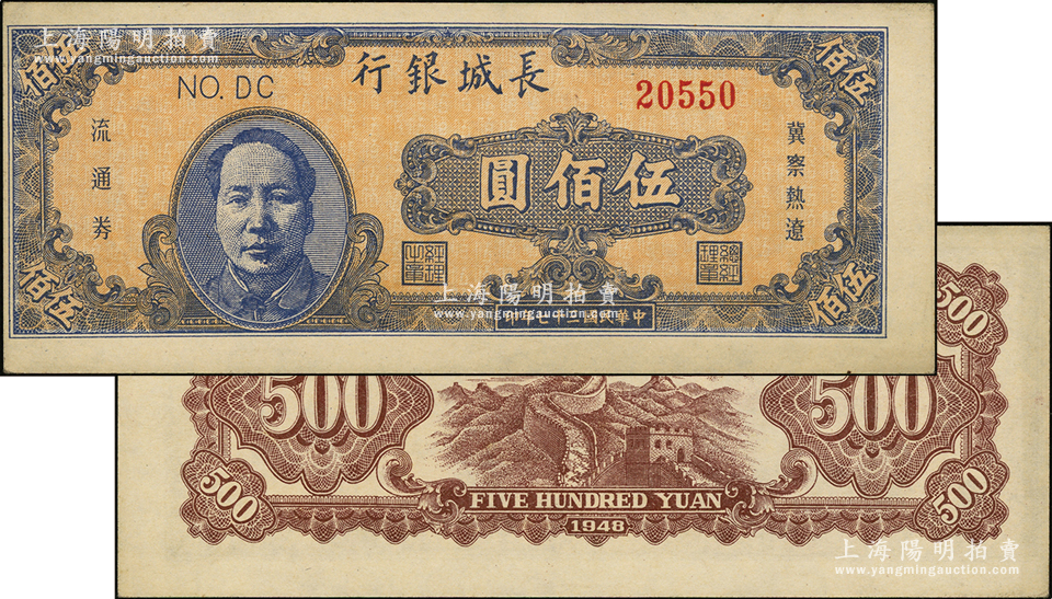 民国三十七年(1948年)长城银行蓝色毛泽东像伍佰圆,属小错版券·正面图案印刷向左移位;源于前辈名家之遗藏,未折九五成新