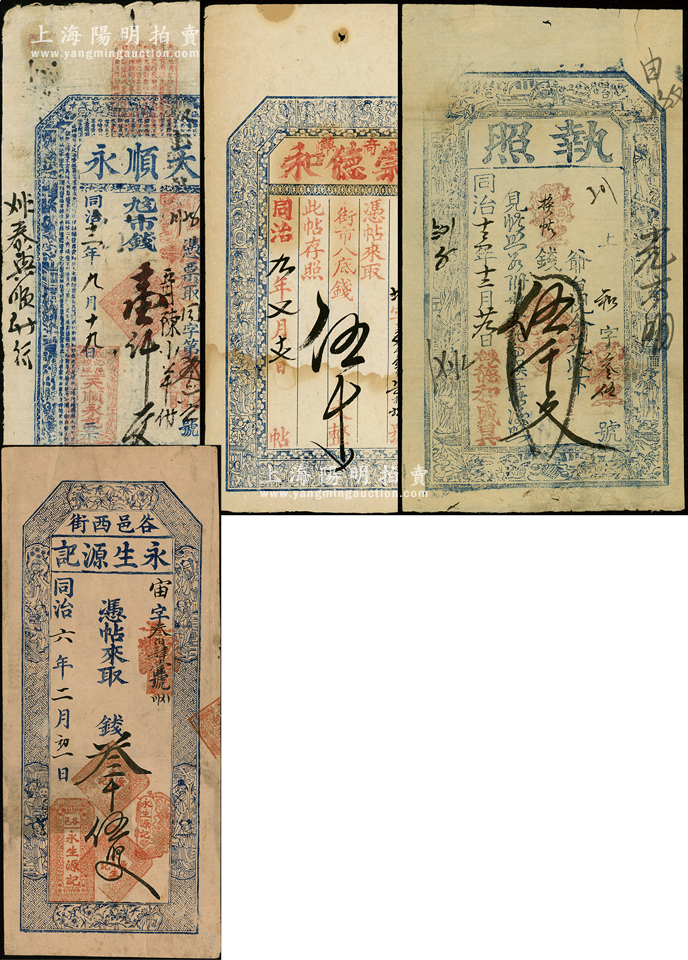山西“同治”年钱帖4种,详分:同治六年(1867年)谷邑·永生源记叁千伍佰文,上印八仙和梅兰竹菊图;同治九年(1870年)忻州·崇德和伍千文;同治十二年(1873年)沁县·天顺永市钱壹仟文;同治十三年(1874)五台·德和盛具“执照”伍千文;王根堂先生藏品,七至八成新