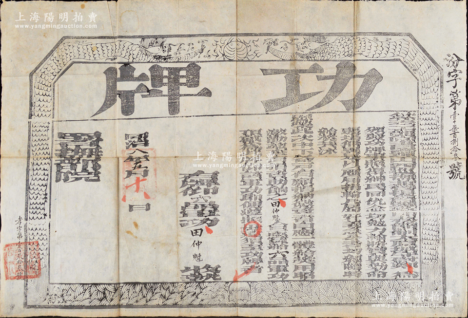 同治八年(1869年)钦差工部尚书署理山西巡抚兼管提督盐政印务节制太原城守尉郑(敦瑾)印发之“功牌”一张,颁给田仲魁氏“六品军功顶戴”,发行于同治朝围剿捻军、回匪之际;此田仲魁氏在《德宗实录》卷67中有记载,光绪朝为提督衔,后随左宗棠西征有功,赏给巴图鲁名号;王根堂先生藏品,少见且保存甚佳,敬请预览