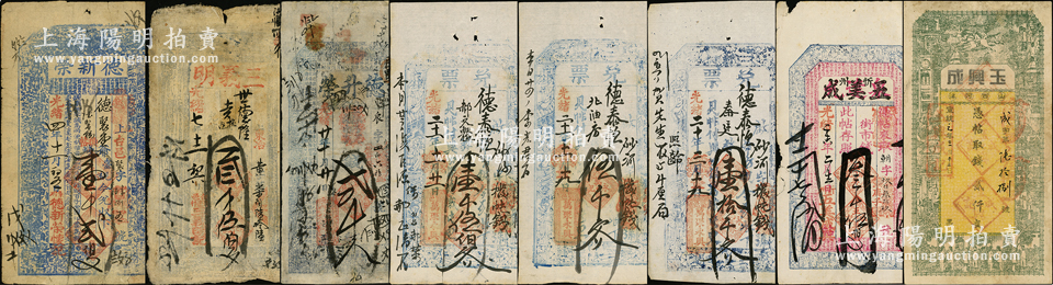 清代山西钱帖8种,详分:光绪四年(1878年)台邑·德新荣壹千贰佰文;光绪七年(1881年)台邑·三义明叁千伍佰文;光绪廿年(1894年)德升荣贰千文;光绪二十至二十一年繁峙(万聚永具)兑票壹千伍佰文、伍千文、壹拾千文;光绪二十六年(1900年)忻州·五美成叁千五佰文;宣统元年(1909年)河津·玉兴成贰仟文;王根堂先生藏品,七至八五成新