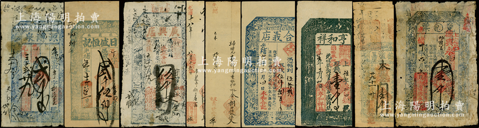 清代山西钱帖9种,详分:光绪三年(1877年)定襄·源溥泉贰千文;光绪五年(1879年)张兰镇·日盛恒记贰千伍佰文;光绪五年(1879年)台邑·广兴店伍千文;光绪十八年(1892年)繁峙·万聚永记肆拾贰千伍佰文;光绪乙未(1895年)定邑·寿世堂捌佰伍拾伍文;光绪年合义店空白帖(票上墨字係后添);光绪廿五年(1899年)台邑·亨和祥壹千文;光绪廿九年(1903年)黎城·德恒昌壹