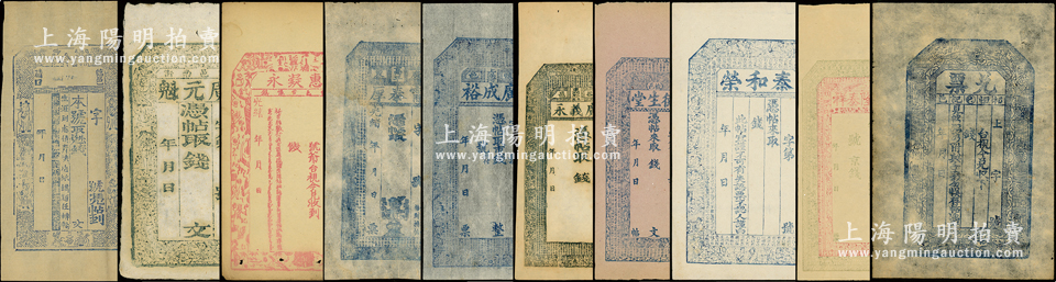 清代山西钱帖等10种,详分:(文水)广元魁、光绪年(台邑)惠凝永、光绪年(高平)甯泰厚、(怀邑)广成裕、(谷邑)广义永、(榆邑)德生堂、泰和荣、临邑碛口、隆泰祥、(祁邑)兑票,均属未填用之空白帖,其中2枚内有水印;王根堂先生藏品,八至九五成新