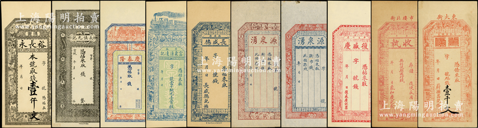 清末民初山西钱帖共10种,详分:宣统年(祁县)长慎记双龙图,(太谷)庆泰隆、富泉湧达记,(离石)长盛德,(定襄)源泉湧不同颜色2种,(平遥)复盛庆、聚和庆记“收条”,(介休)蔚源昌记“兑条”、裕长永,均属未填用之空白帖;王根堂先生藏品,八至九五成新