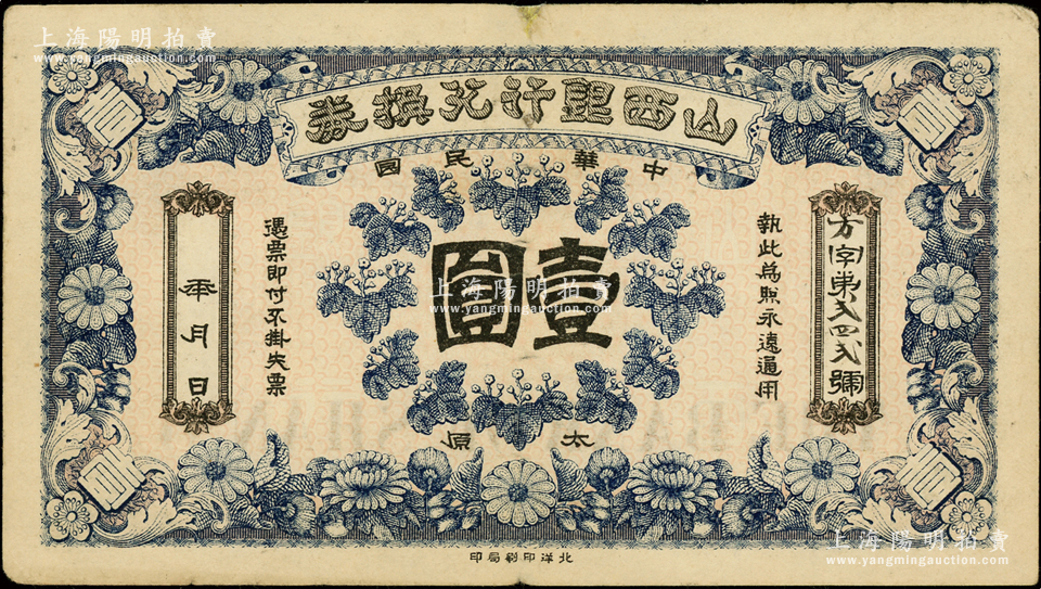 民国年·山西银行兑换券壹圆,太原地名,北洋印刷局印;王根堂先生藏品,少见,八成新