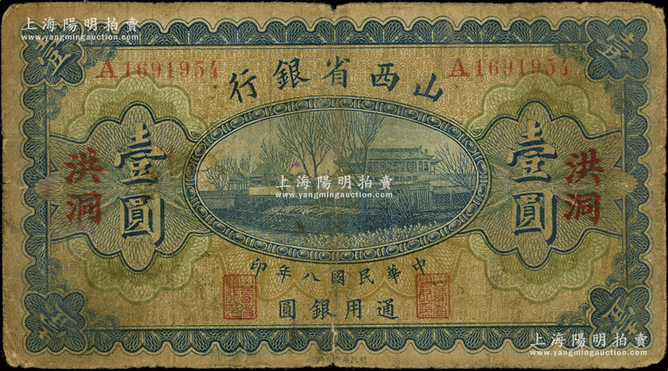 民国八年(1919年)山西省银行壹圆,洪洞地名,A字轨7位号,背面为M. P. Chi和Y. C. Hsü第一版大签名;王根堂先生藏品,少见,原票七成新