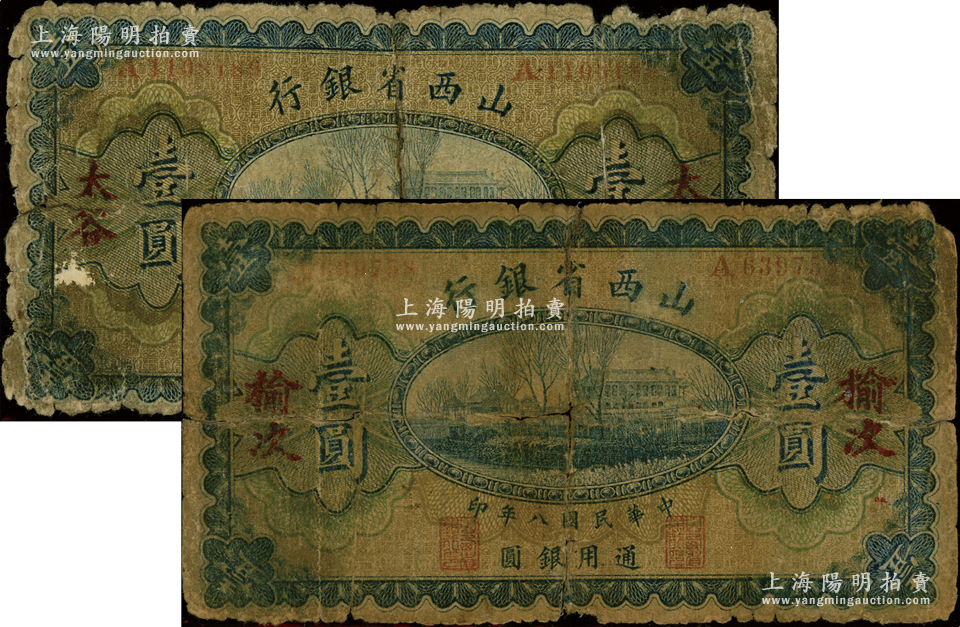 民国八年(1919年)山西省银行壹圆共2种,分别为“太谷”和“榆次”地名,背面均属第一版签名券;王根堂先生藏品,少见,五成新