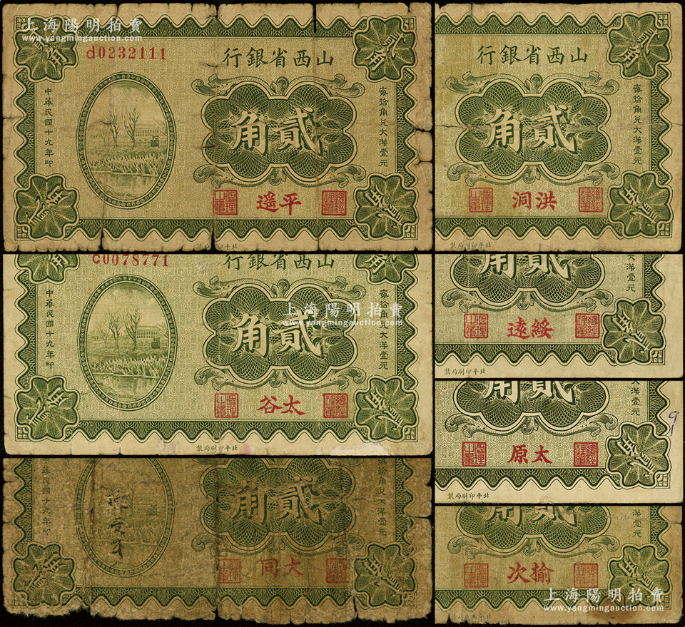 民国十九年(1930年)山西省银行贰角各地名券共7种不同,分别加印洪洞、平遥、绥远、太谷、太原、大同、榆次地名;王根堂先生藏品,五至八成新,敬请预览