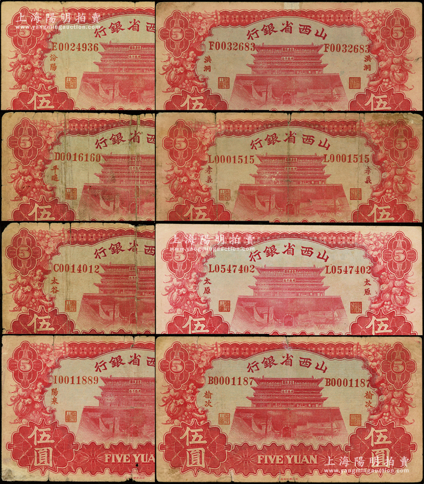 1933年山西省银行伍圆各地名券共8种不同,详分:汾阳、洪洞、平遥、孝义、太谷、太原、阳泉、榆次等地名,背面均为Y. Fu和S. Wang签名,能收集到如此丰富之品种实非易事,值得推重;王根堂先生藏品,五至八五成新,敬请预览