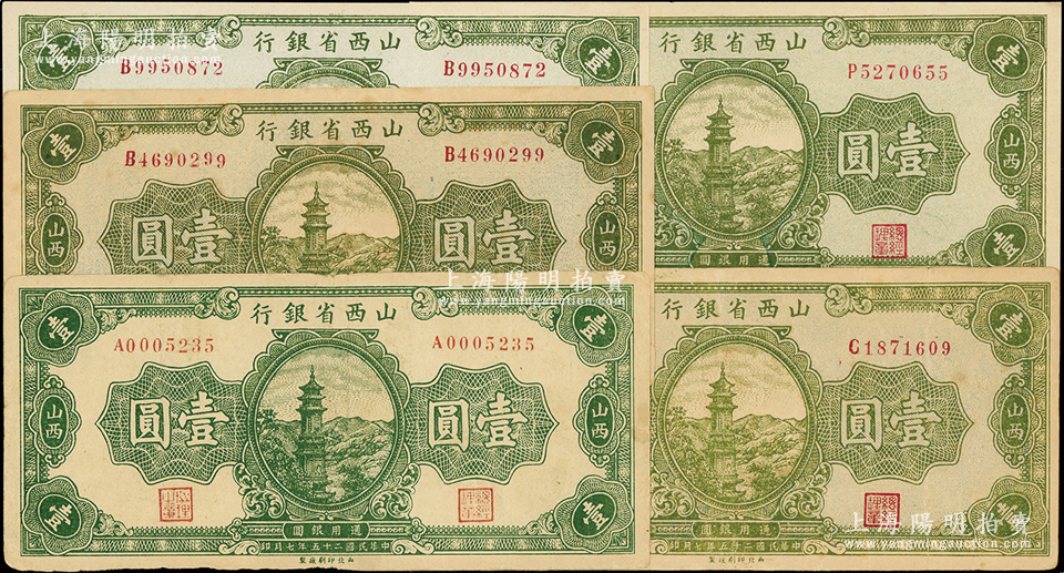 民国二十五年(1936年)山西省银行绿色宝塔图壹圆不同冠字共5枚,内含A、B不同颜色2种、C和P冠字各1枚;王根堂先生藏品,八至九五成新