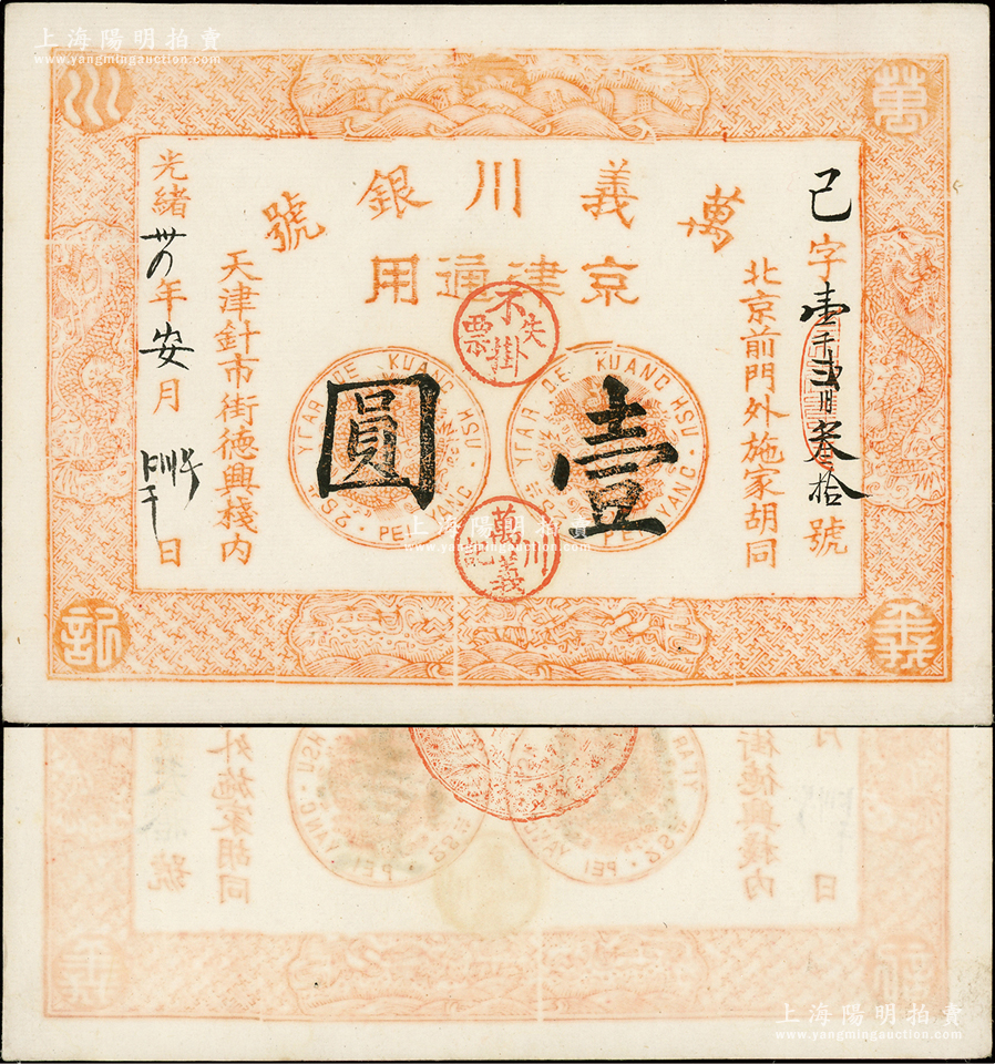光绪卅四年(1908年)万义川银号壹圆,京津通用,棉纸版,上印双龙及旭日波浪等图;源于前辈名家之遗藏,少见,未折九五成新