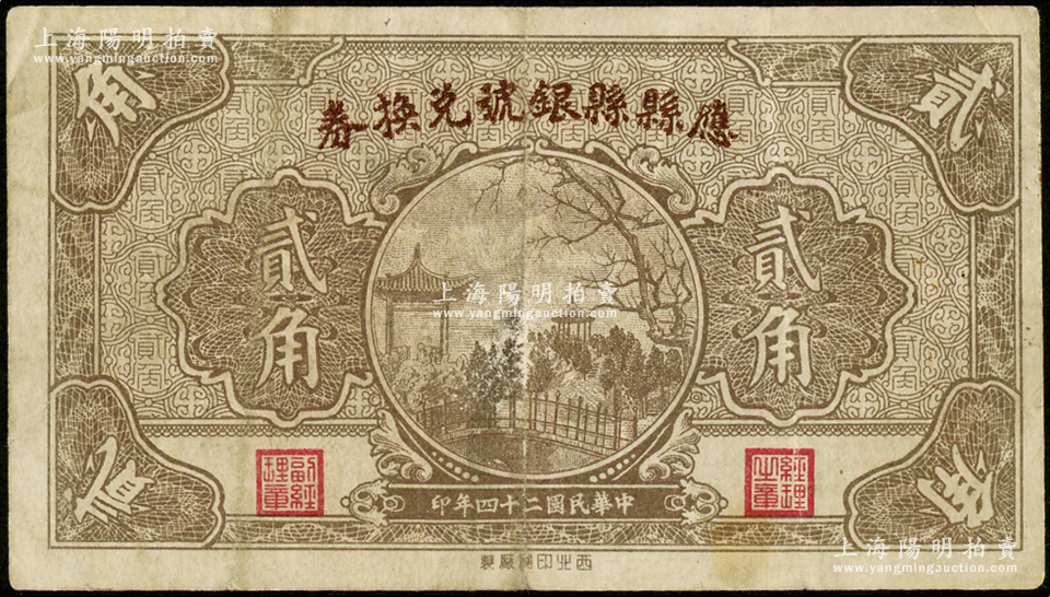 民国二十四年(1935年)应县县银号兑换券贰角,王根堂先生藏品,七至七五成新