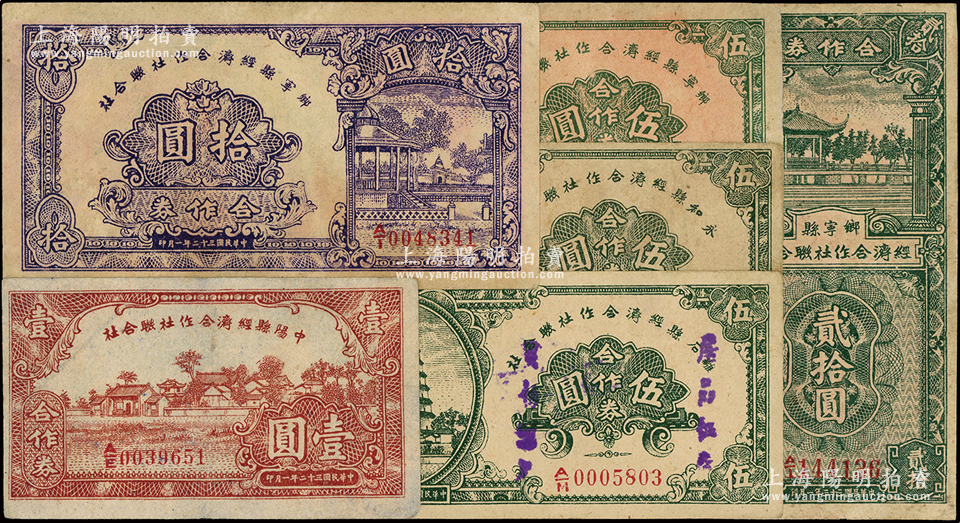 晋西各县经济合作社联合社合作券共6种,详分:1943年中阳县壹圆、离石县伍圆、永和县伍圆;乡宁县1943年伍圆、拾圆,1944年贰拾圆;王根堂先生藏品,七至八成新