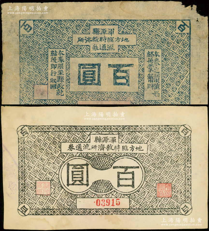 抗战时期(山西)浑源县地方临时救济所流通券黑色百圆、蓝色百圆共2枚不同,其中蓝色券上印有“本券之价值始终与蒙币同”,由此可推知当属伪蒙疆政权纸币之体系;王根堂先生藏品,少见,七至九成新