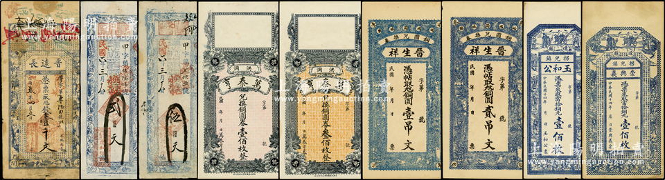 民国山西钱票共9种,详分:(孝义)晋远长1914年壹千文;(崞县)德和恒记贰佰文、伍佰文;(洪洞)万泰亨铜圆券壹佰枚、叁佰枚;(潞城)晋生祥铜圆壹吊文、贰吊文;(辽县)玉和公1925年铜元壹佰枚、崇兴义1925年铜元壹佰枚;王根堂先生藏品,八至九成新