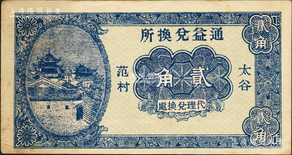民国二十年(1931年)通益兑换所贰角,太谷范村地名;王根堂先生藏品,属稀见品种,八五成新