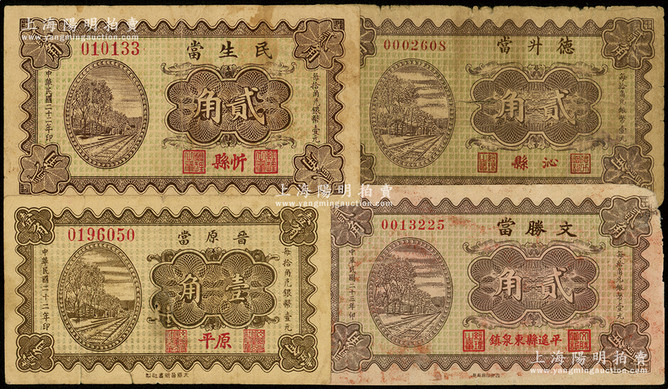 山西当铺钞票4种,详分:1933年(原平)晋原当壹角、(忻县)民生当贰角;1934年(平遥)文胜当贰角、(沁县)德升当贰角;王根堂先生藏品,七至七五成新