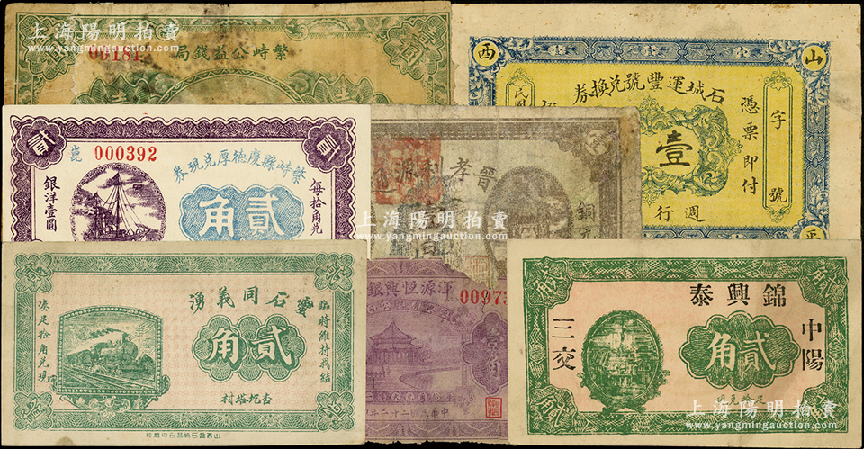 山西各县纸币7种,详分:(平顺)石城运丰号兑换券壹圆,晋孝利源通1927年壹百枚,繁峙公益钱局1929年壹圆;1932年繁峙县庆德厚兑现券贰角、(中阳)锦兴泰贰角、灵石同义湧贰角;浑源恒兴银号1933年壹角;王根堂先生藏品,破损品至九五成新