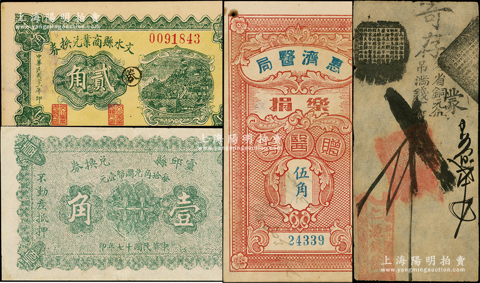 清末民国各省民间钞票4种,详分:清代(北京)仁源钱铺贰吊;灵邱县兑换券1928年壹角;文水县商业兑换券1932年贰角;(广州)惠济医局乐捐赠医券伍角;海外回流,八至九成新