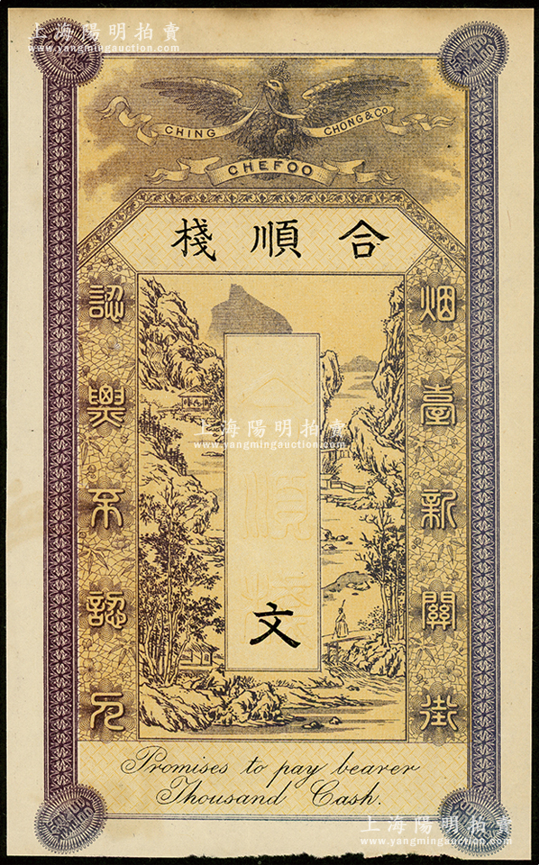清末(烟台)合顺栈钱票未填用,“烟台新关街”地名,上印紫色皇冠飞鹰和山水风景图;日本回流品,少见,八五成新