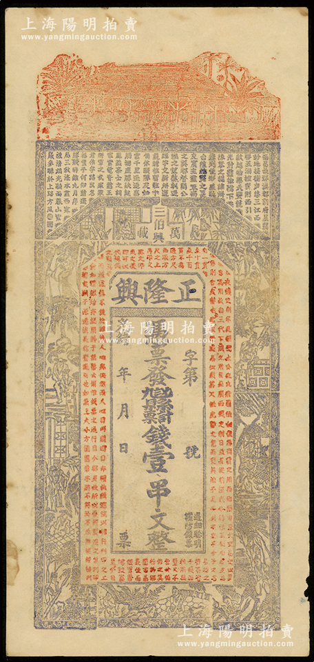 光绪年(江西万载)正隆兴票钱壹串文,上印房屋、古人物及唐代王勃《滕王阁序》古文,背印教堂和教会神话图,未折八五成新