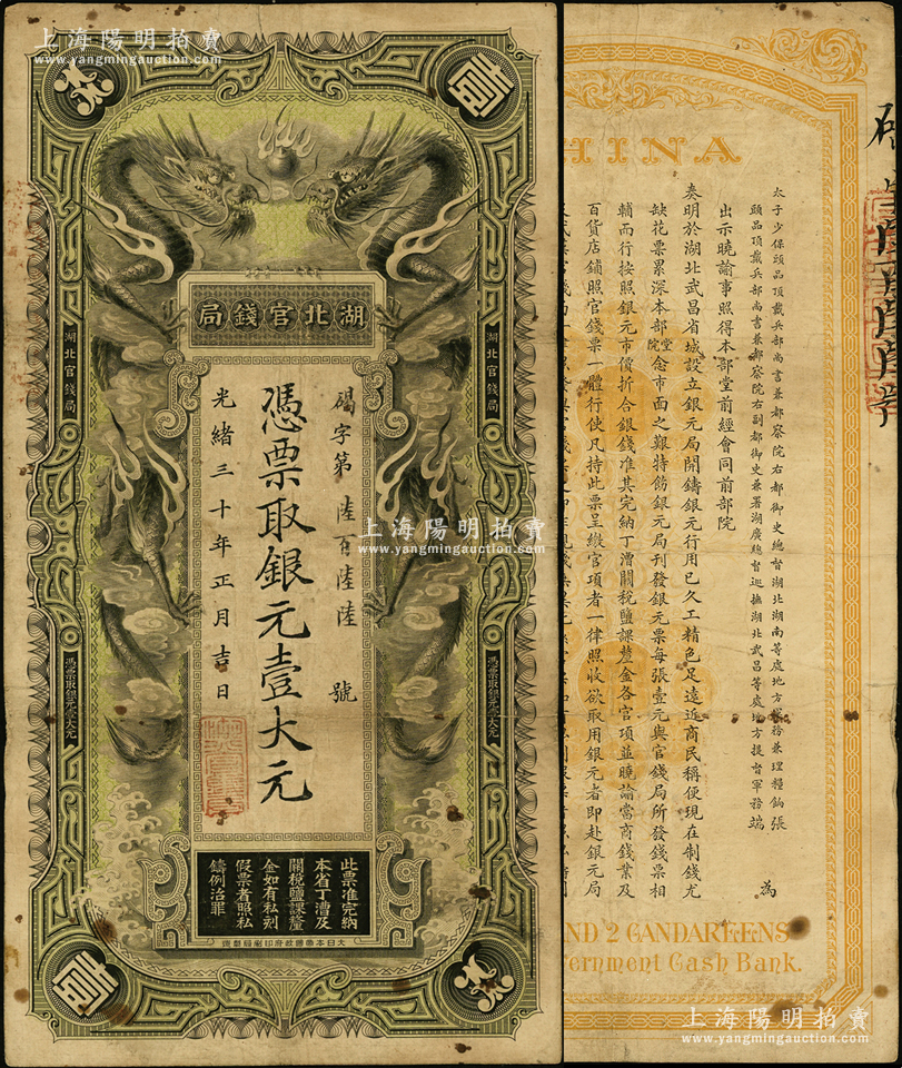 光绪三十年(1904年)湖北官钱局银元壹大元,趣味号码“碣字第666号”,背印湖广总督张之洞、湖北巡抚端方之告示,少见,原票七五成新