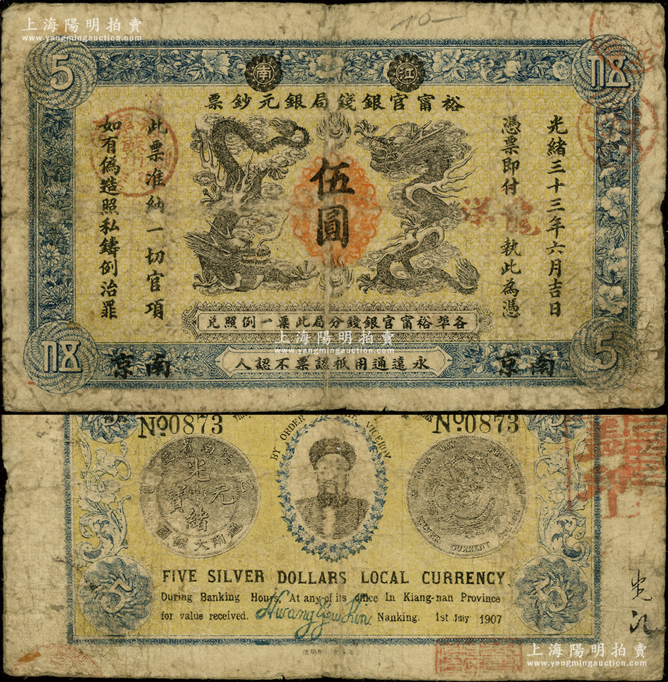 光绪三十三年(1907年)江南裕宁官银钱局银元钞票“龙洋”伍圆,南京地名,上盖“苏州”地名戳;背为银币版,印有两江总督端方氏头像;资深藏家出品,原票七成新