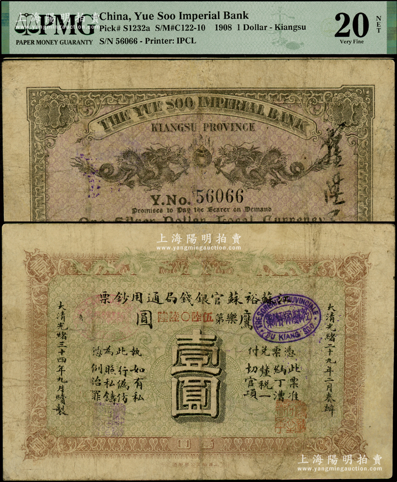 光绪三十四年(1908年)江苏裕苏官银钱局通用钞票鹰圆壹圆,背盖“沪”(上海)地名,有修补,PMG VF 20 NET