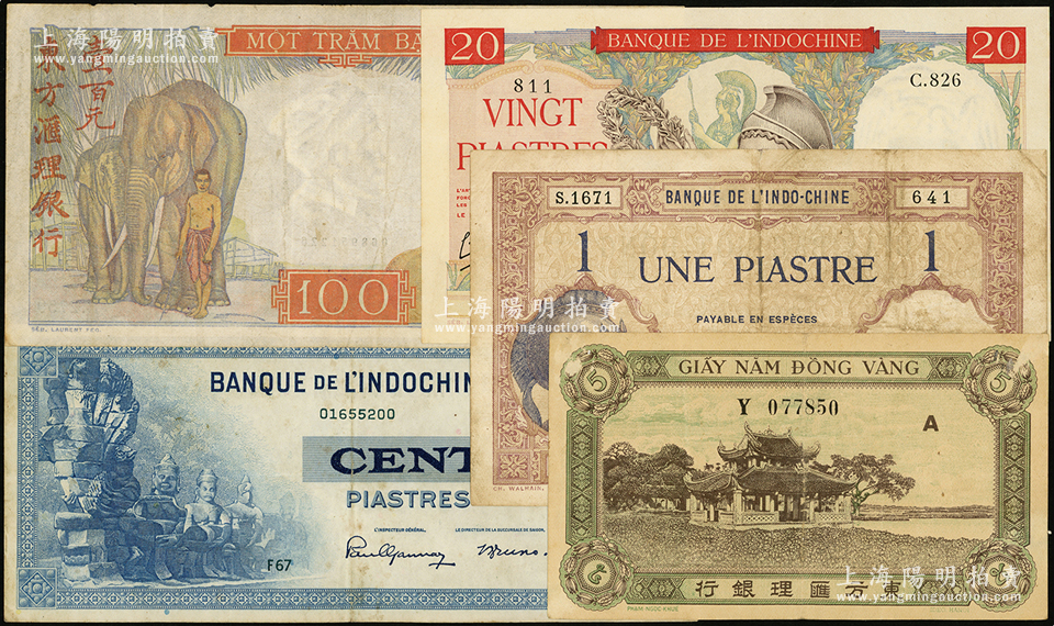 东方汇理银行纸币5种,详分:(1921年)银壹元、(1936年)贰拾元、(1942年)伍元、(1945年)蓝色壹百元、(1947年)大象与青年壹百元;台湾藏家出品,七至九五成新