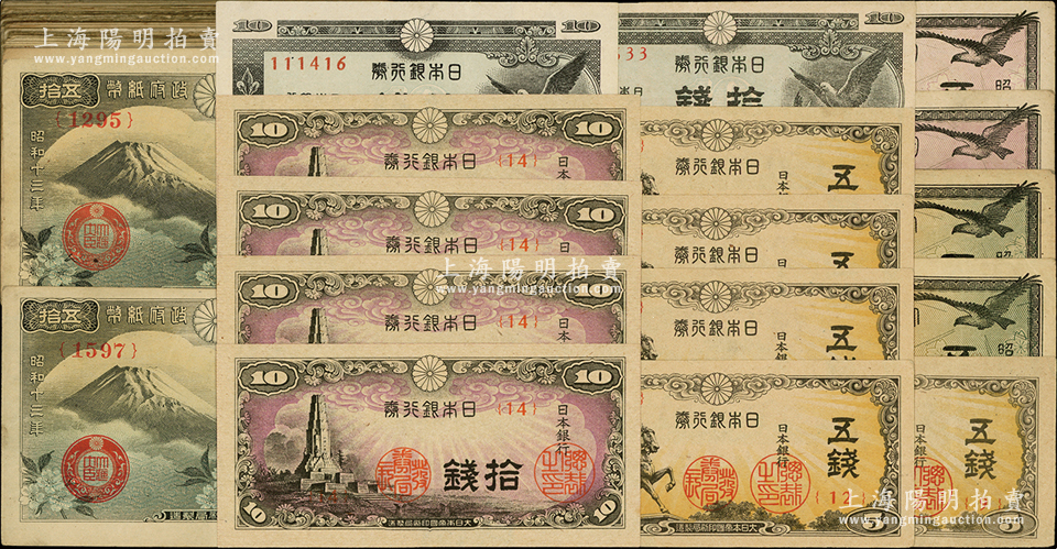日本银行小额纸币共102枚,详分:五钱5枚、拾钱2种图案6枚、五拾钱不同年份和版式91枚,六至九八成新,敬请预览