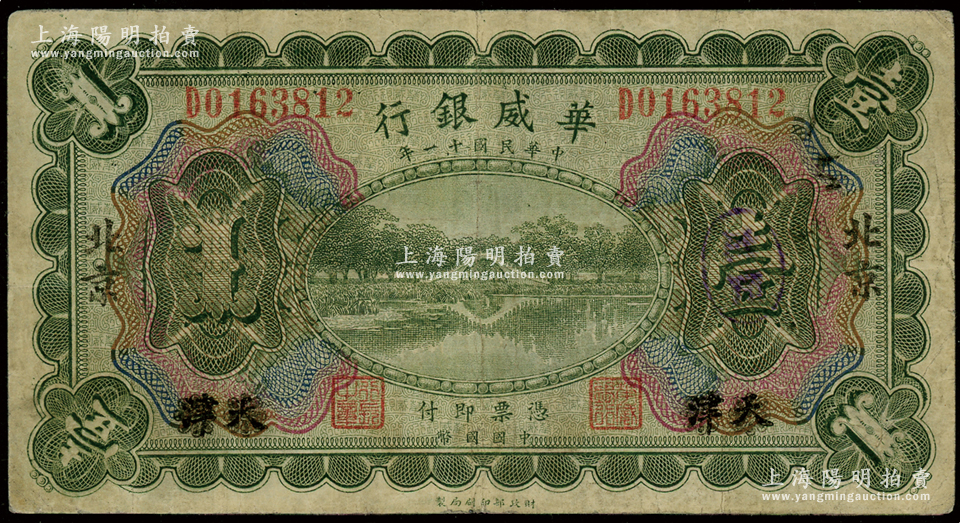 民国十一年(1922年)华威银行多色版壹圆,天津改北京地名,八成新
