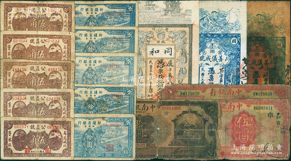 民国纸币一组共16枚,详分:中南银行1921年上海拾圆,1927年上海伍圆、汉口伍圆;新疆省银行1950年银圆票蓝色耕种图拾圆5枚;(曹州)同和1924年铜元贰串;(留坝县)善仪成号1926年油布壹串文、白布壹串文;(高苑)公益号1940年伍角5枚;五至七五成新,敬请预览