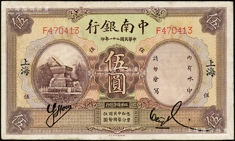民国二十一年(1932年)中南银行伍圆,上海地名,近八成新