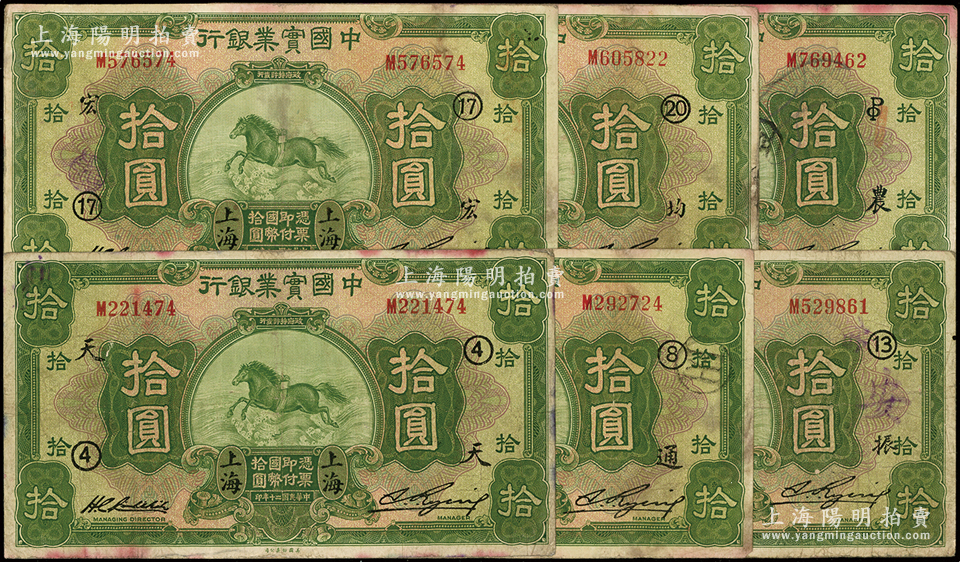 民国二十年(1931年)中国实业银行上海拾圆领券共6种,分别加印“④·天”、“⑧·通”、“13·振”、“17·宏”、“20·均”和“农·PO英文组合”,七至七五成新
