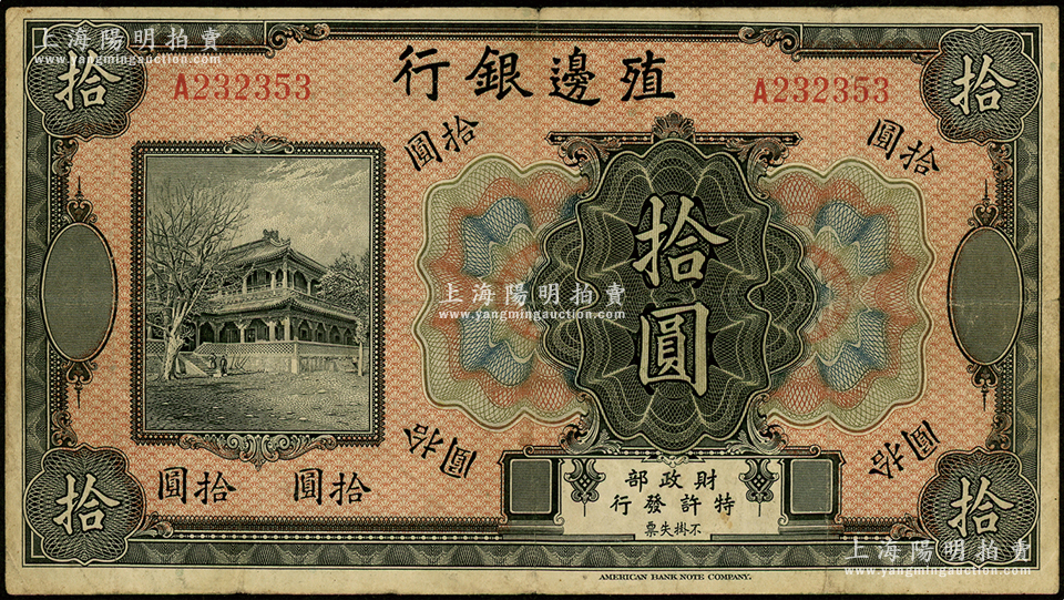 殖边银行无年份美钞版拾圆,海外回流,七五成新