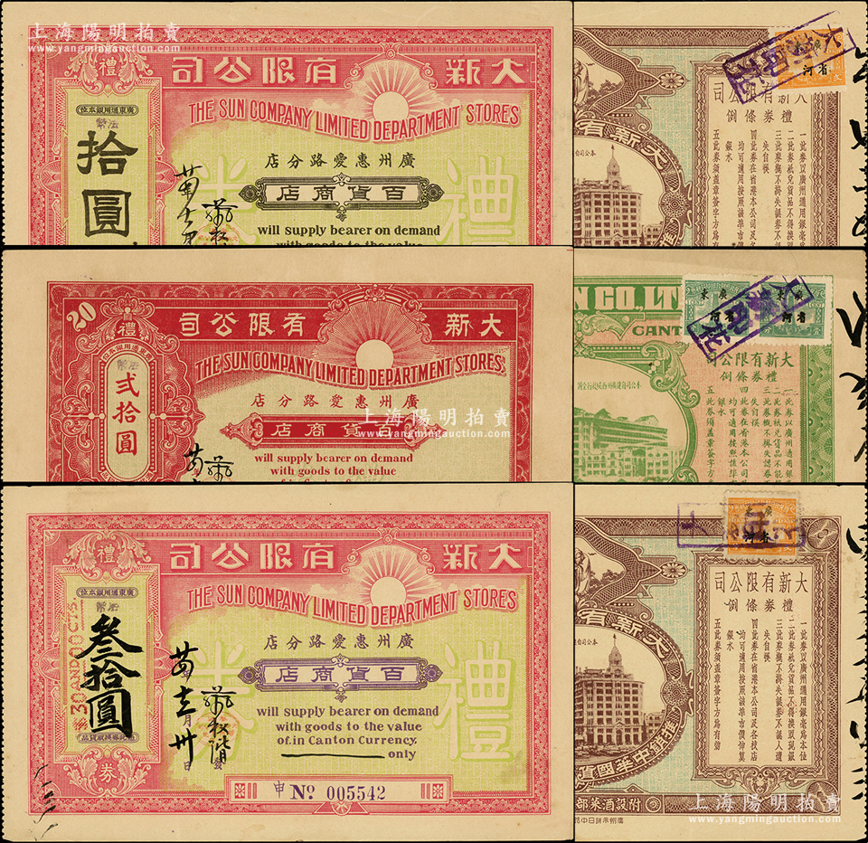 民国廿四年(1935年)大新股份有限公司(广州惠爱路分店)百货商店礼券法币拾圆、贰拾圆、叁拾圆共3种不同,均背印广州西堤分公司大楼;源于该公司创始人蔡昌家族之遗存,罕见,八至九成新