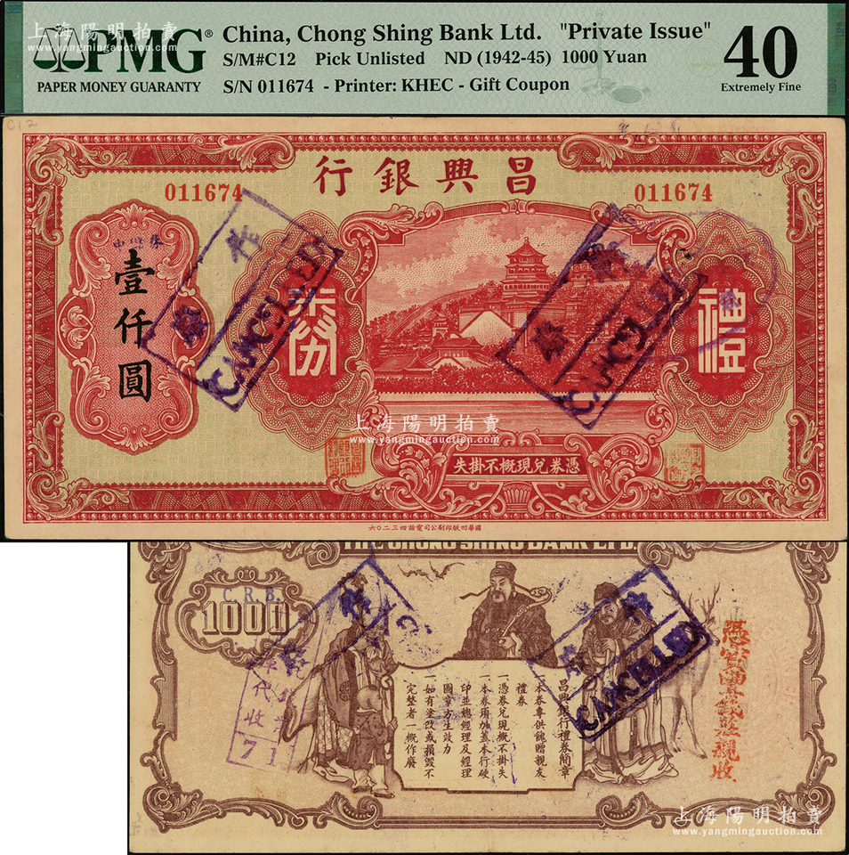 昌兴银行礼券红色壹仟圆,属老上海商业银行,上印万寿山风景,背印福禄寿三星,少见,PMG 40 EF