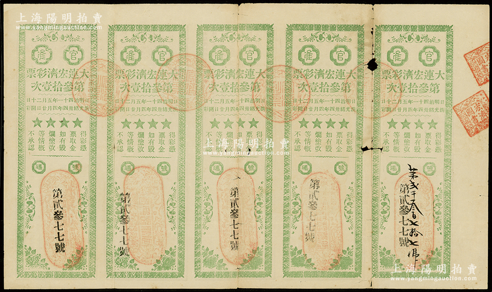 光绪卅四年(1908年)大连宏济彩票·第叁拾壹次·整版大全张共5枚联体,此彩票乃由昔年大连八大富豪之一的刘肇亿氏所发行,其创办的宏济善堂曾是清末著名的慈善机构;海外藏家出品,罕见,骑缝处有裂缝,近七成新