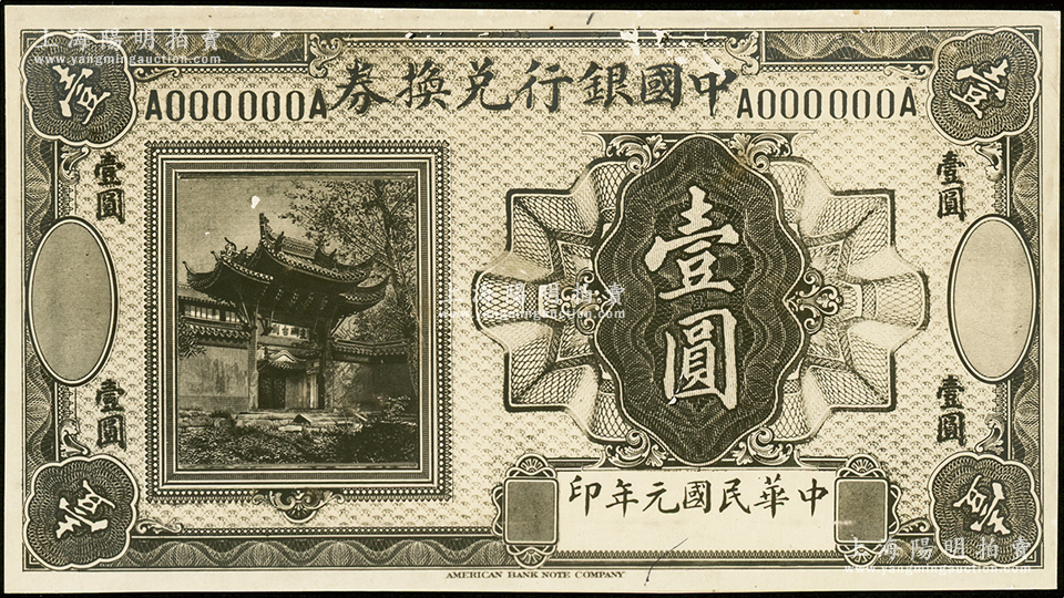 民国元年(1912年)中国银行兑换券美钞版牌楼图壹圆设计之照片样稿,此种版式未见经传,背面书有编号等;资深藏家出品,2013年得自海外拍卖美钞公司样稿专场,少见,九五成新