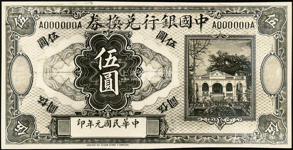 民国元年(1912年)中国银行兑换券美钞版行屋图伍圆设计之照片样稿,此种版式未见经传,背面书有编号等;资深藏家出品,2013年得自海外拍卖美钞公司样稿专场,少见,九五成新