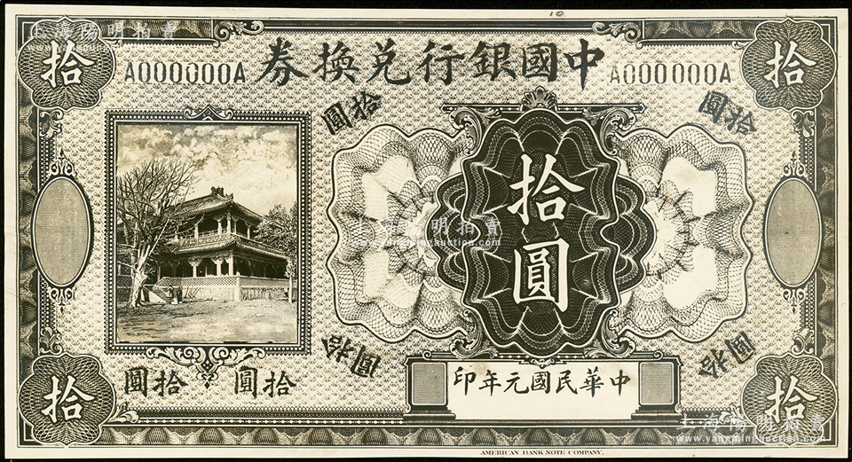 民国元年(1912年)中国银行兑换券美钞版楼阁图拾圆设计之照片样稿,此种版式未见经传,背面书有编号等;资深藏家出品,2013年得自海外拍卖美钞公司样稿专场,少见,九五成新
