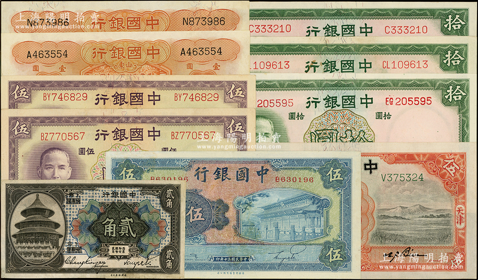 中国银行纸币10枚,详分:1918年哈尔滨改上海贰角,1931年德纳罗版天津伍圆,1934年德纳罗版山东壹圆2枚,1937年德纳罗版伍圆2枚、拾圆3枚,1941年商务版岱庙图伍圆,八至九八成新