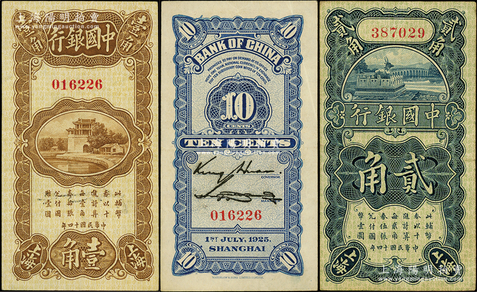 民国十四年(1925年)中国银行竖式壹角、贰角共2枚不同,上海地名,无字轨,均属金还·宋汉章第一版签名;海外藏家出品,八至九成新