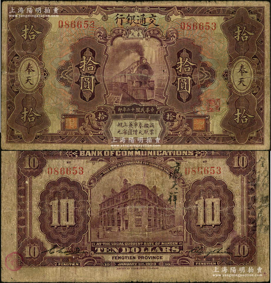 民国十二年(1923年)交通银行紫色拾圆,奉天地名,张謇·陈艺签名,属稀见品种;资深藏家出品,原票七成新