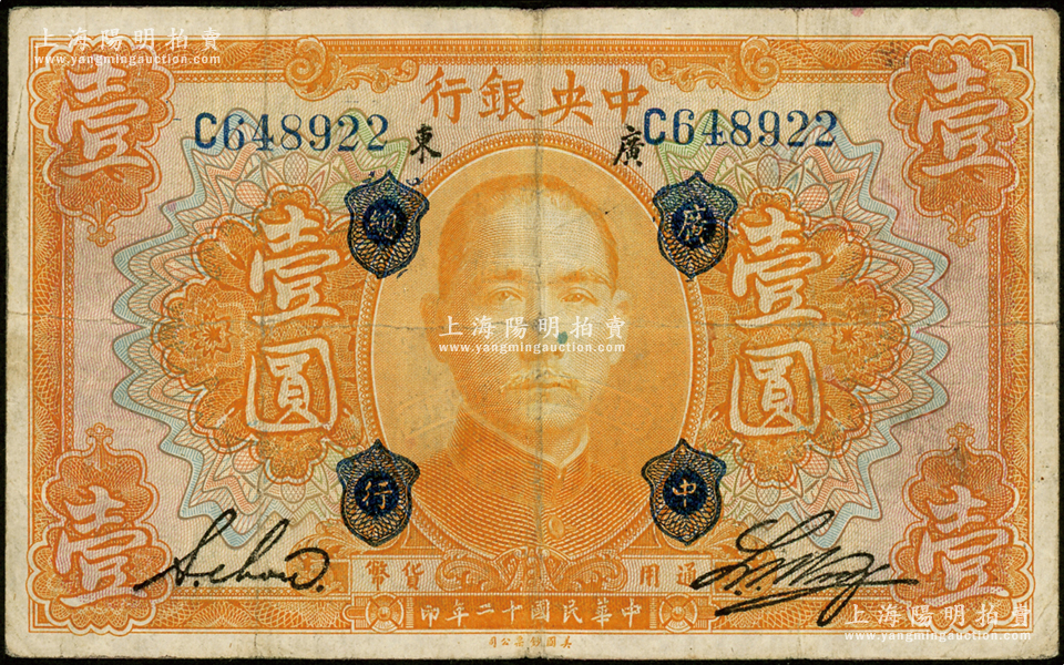 民国十二年(1923年)中央银行桔色壹圆,加盖“广中总行”,单字轨,黄隆生·周斯铭英文签名,近八成新
